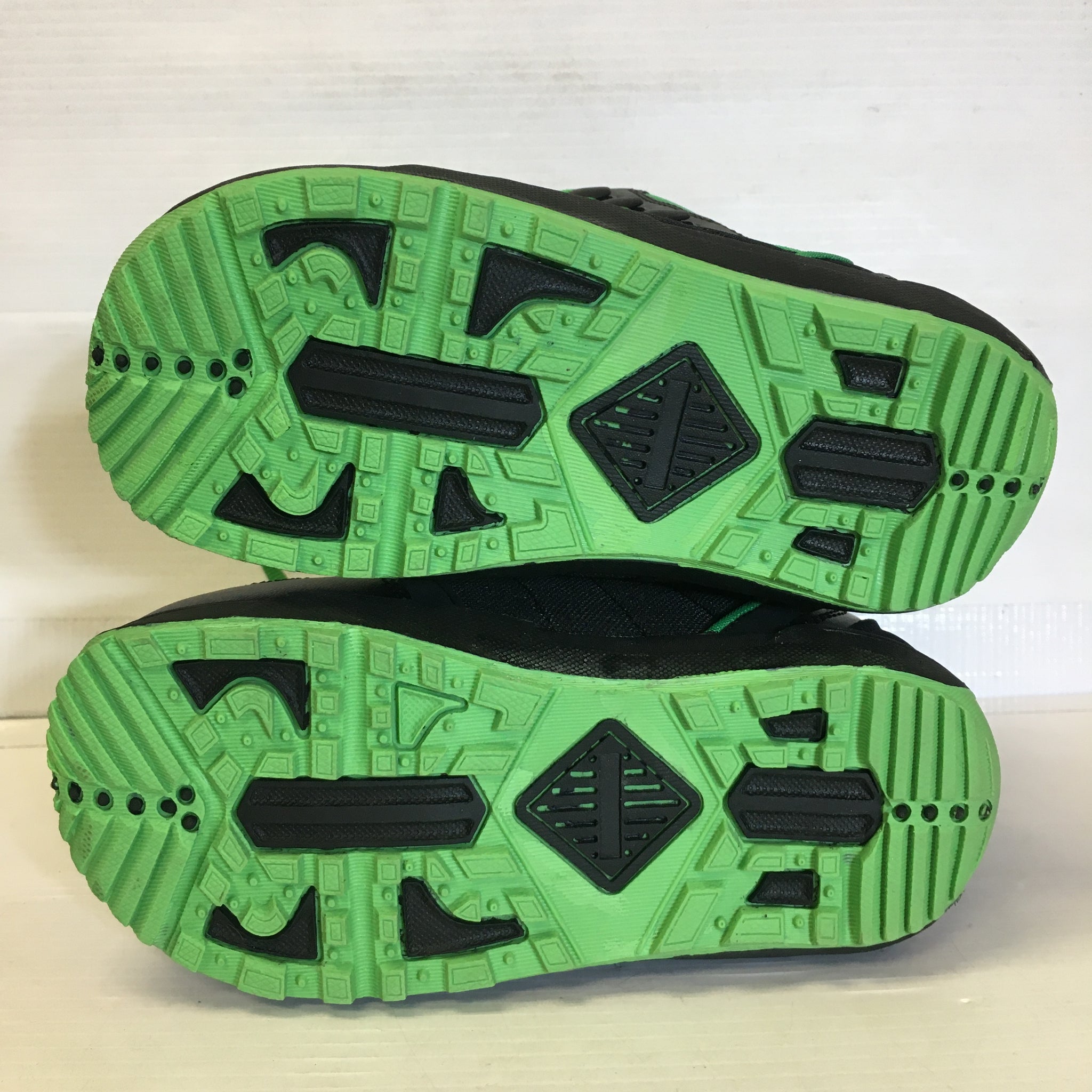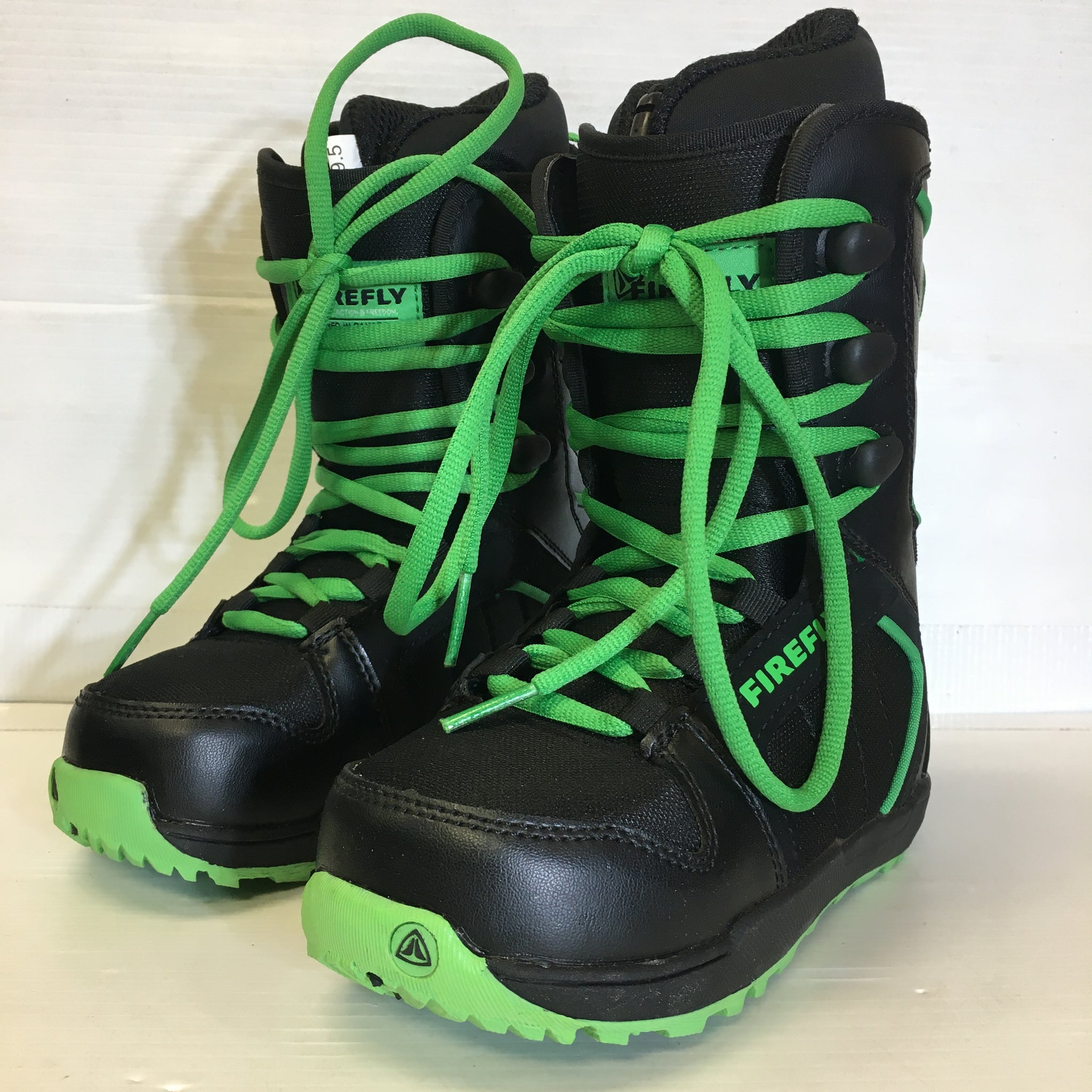 A pair of black and green firefly snowboard boots that are in great condition.